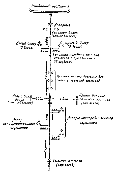 Если, например, пешая походная застава высылается на 1--2 километра, т. е. во