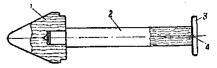Рис. 3. Катушка; 1 - деревянная головка; 2 - деревянный стержень; 3 - металлическая шайба; 4 - гвоздь |