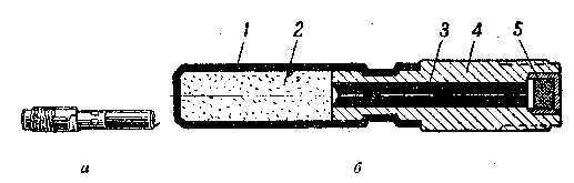 разрез запала; 1 - гильза; 2 - вышибной заряд; 3 - пороховой столбик (замедлитель); 4 - втулка замедлителя; 5 - капсюль-воспламенитель |