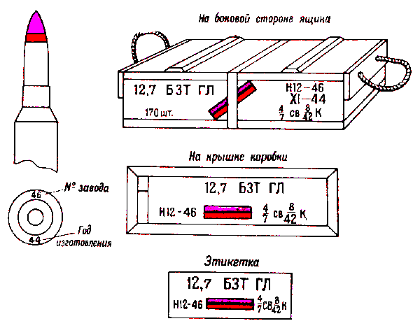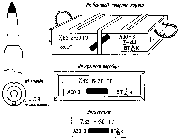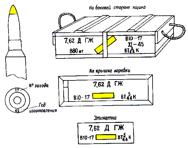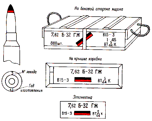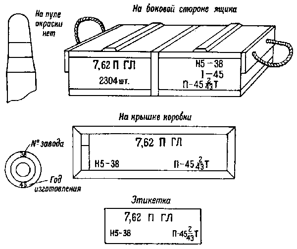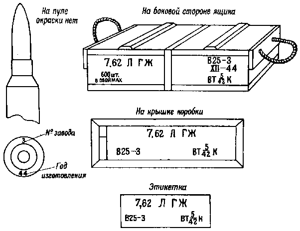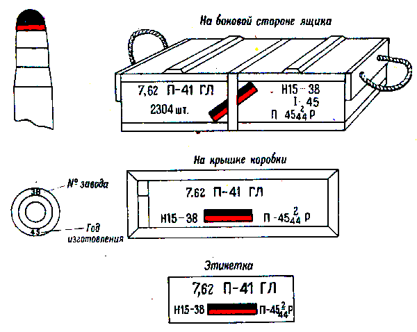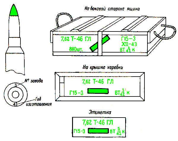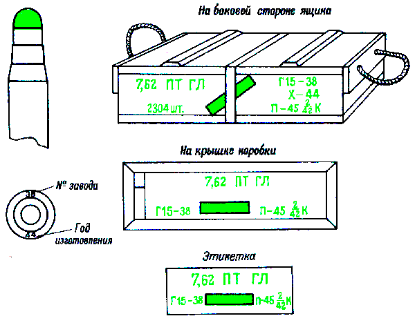 * Патроны с трассирующими пулями, изготовления начиная с 1942 г., на укупорочном ящике имеют трафарет черного цвета с зелёной отличительной полосой на боковых стенках.