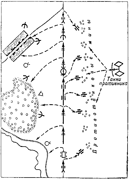 предметами и, в зависимости от обстановки, встречает танки огнем и связками