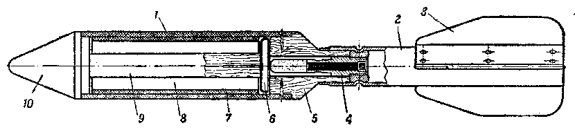 гранаты обр. 1942 г. 1 - корпус гранаты; 2 - стабилизатор; 3 - перья стабилизатора; 4 - запал; 5 - деревянный поддон; 6 - металлическая шайба; 7-картонные вкладыши; 8 - место для листовок с текстом; 9 - деревянный стержень катушки; 20 - деревянная головка |