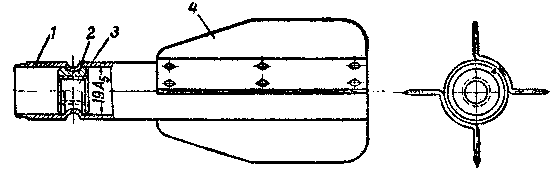Стабилизатор (рис. 4) служит для стабилизации гранаты на полёте. Он состоит из цилиндрической трубки, втулки и перьев.
