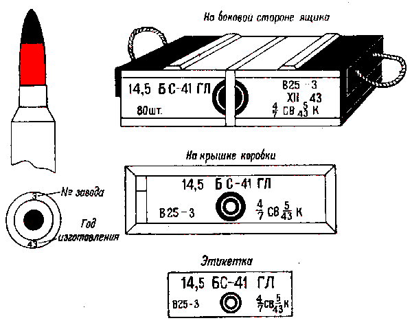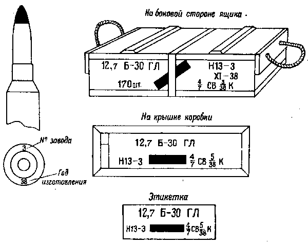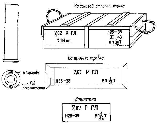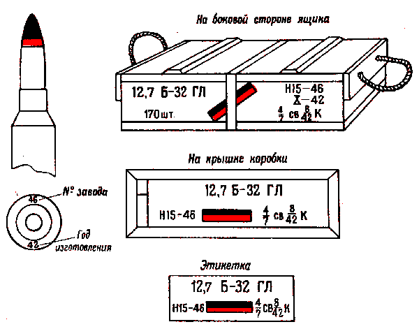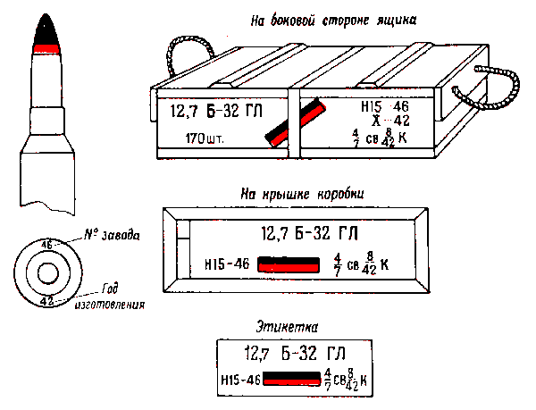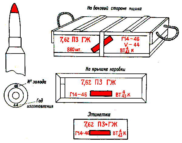 * Патроны с трассирующими пулями, изготовления начиная с 1942 г., на укупорочном ящике имеют трафарет черного цвета с зелёной отличительной полосой на боковых стенках.